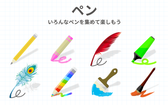 最初は線や図形を描くものとして鉛筆を使います。ステージを進めると、シャープペン、クレヨン、マーカーなど25種類以上のペンを集められ、ゲーム内で使うことができます。ペンの使用にはゲーム内アイテムのコインが必要となります。コインは、ステージを初回でクリアしたり、広告動画を見ることで得られます。